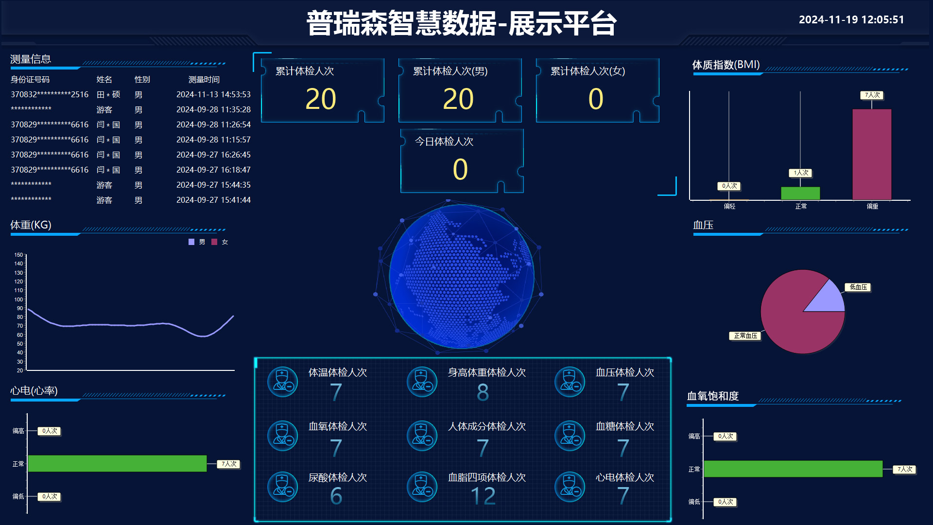 展示包括所有體檢人次、按性別劃分的體檢數據,幫助管理員快速掌握體檢參與的總體情況