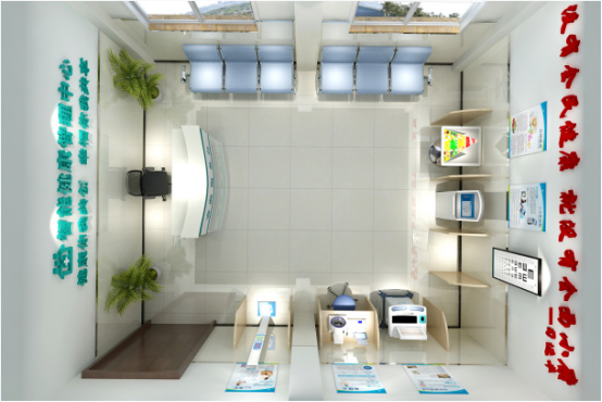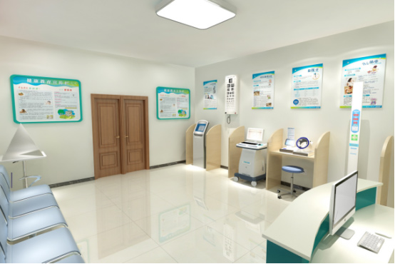 該方案是經典的健康小屋落地模式,設有登記服務臺、體檢等待區、健康宣教區、體檢設備分布區,可合理利用場地空間,根據資金預算進行布署。適用于鄉鎮衛生院、社區衛生服務中心、醫養結合機構、療養康復機構等;