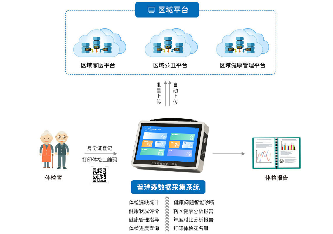 該系統(tǒng)按照縣、鄉(xiāng)、村三級應(yīng)用設(shè)計,以便捷式應(yīng)用、智能化應(yīng)用、多場景應(yīng)用為導(dǎo)向,按照滿足院內(nèi)專業(yè)體檢、下鄉(xiāng)便攜式體檢、移動體檢車體檢及區(qū)域化融合體檢等多種模式搭建,為基層醫(yī)療機(jī)構(gòu)公共衛(wèi)生信息化最后一公里提供一站式解決方案,實現(xiàn)國家“讓數(shù)據(jù)多跑路,百姓少跑腿”的相關(guān)要求。