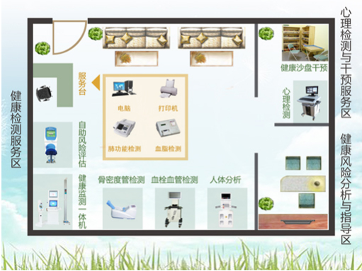 健康小屋配置分兩大部分組成:測(cè)量工具配置和干預(yù)指導(dǎo)配置。 1、測(cè)量工具配置。就是配置常用的簡(jiǎn)便的測(cè)量設(shè)備,如身高儀、體重儀、血壓儀、肺功能儀、血糖監(jiān)